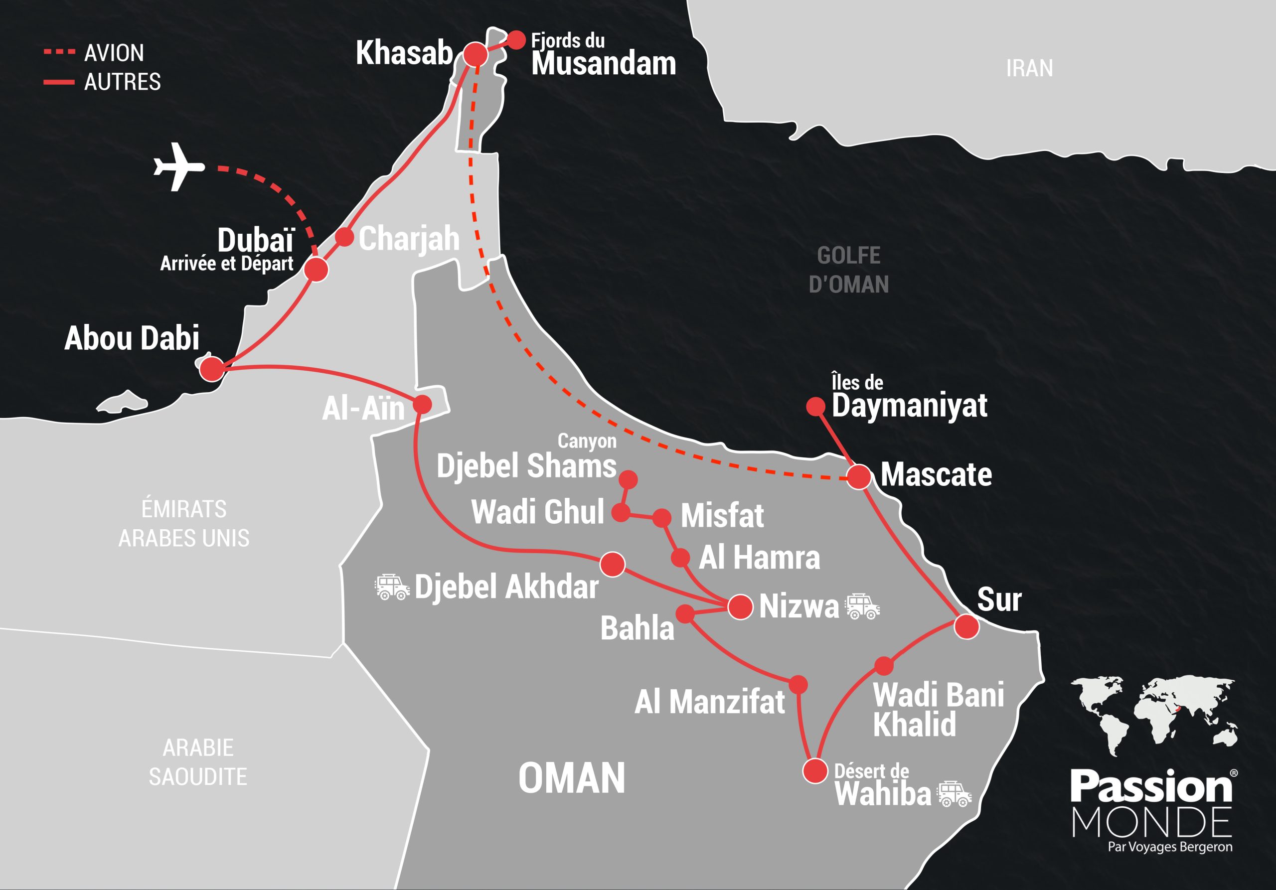 • Mascate: Visite du musée Bait Al Zubair, du quartier du Ministère avec le Palais Al Alam, du souk de Matrah, de la Grande Mosquée et de l’opéra royal de Mascate; visite extérieure des forts portugais Al-Jalali et Al-Mirani; croisière vers l’île de Daymaniyat; visite du village de Wakan